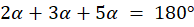Oblicz miary kątów wewnętrznych trójkąta, wiedząc, że wyraża je stosunek 2 : 3 : 5.