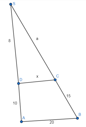 Przyjmij oznaczenia jak na powyższym rysunku. Zacznij od obliczenia długości x, korzystając z twierdzenia Talesa. Kolejno oblicz długość odcinka a. Następnie oblicz obwód trapezu ABCD i trójkąta ABS.