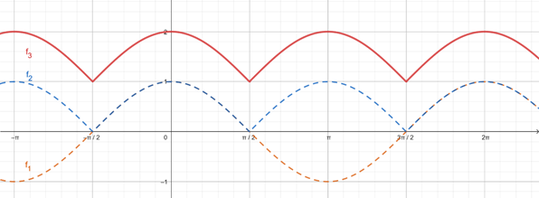 Narysuj wykres cosinusa. Zrób wartość bezwzględną z całej funkcji – dobij to, co pod osią OX nad nią. Przesuń wykres o jedną jednostkę do góry. Zauważ, że funkcja przyjmuje wartości od 1 do 2 włącznie.