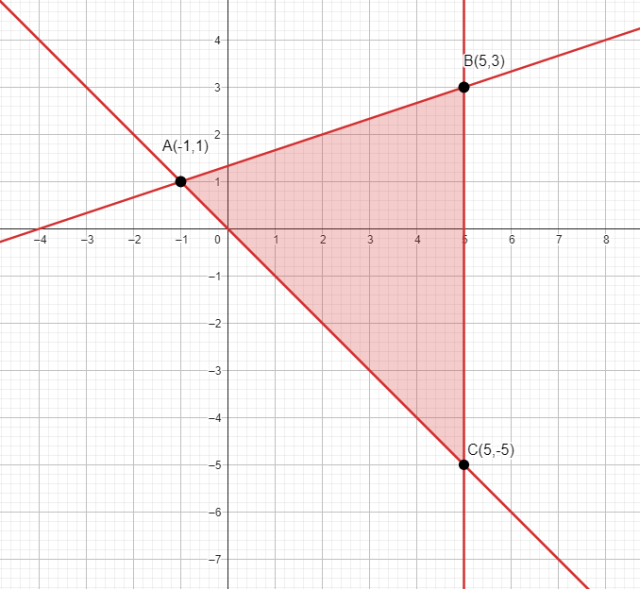 Przekształć nierówności wchodzące w skład układu. Stwórz szkic, czyli część wspólną półpłaszczyzn wyznaczanych przez składowe nierówności i wyznacz współrzędne wierzchołków powstałej figury. Odczytaj lub oblicz długości boków potrzebnych do obliczenia pola figury.