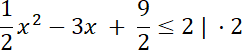 W tym zadaniu musisz rozwiązać nierówność kwadratową, dla funkcji f(x) = 0,5x2 + bx + c. Wartości współczynniku wyznacz na podstawie współrzędnych wierzchołka paraboli. Po wstawieniu wartości liczbowych, za współczynniki, zapisz nierówność.