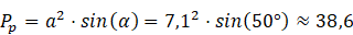 Pole podstawy, która jest rombem, oblicz ze wzoru , gdzie a – długość boku rombu i α – miara kąta zawartego między nimi. Długość boku rombu wyznacz z zależności trygonometryczny w trójkącie prostokątnym.
