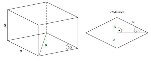 Wyznacz objętość graniastosłupa prostego o podstawie rombu, którego krótsza przekątna ma długość 6, a mniejszy z katów wewnętrznych ma miarę 50°, tak jak pokazuje rysunek. Wynik podaj z dokładnością do części dziesiętnych.