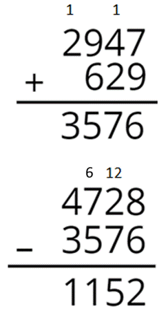 4728 – (629 + 2947) = 4728 – 3576 = 1152