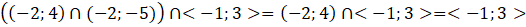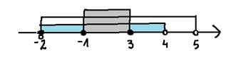 Na osi liczbowej zaznacz podane przedziały. Jako pierwsze wykonaj działanie w nawiasie. Narysuj na osi liczbowej i zaznacz kolorem ich część wspólną. Część wspólną przedziałów stanowi zbiór liczb należących jednocześnie do obu przedziałów. Następnie wyznacz część wspólną otrzymanego zbioru, z podanym zbiorem. Przedziały zaznacz na osi liczbowej i zaznacz kolorem ich część wspólną. Część wspólną przedziałów stanowi zbiór liczb należących jednocześnie do obu przedziałów. W tym zadaniu zaznacz przedział liczbowy na osi. Jeśli koniec przedziału jest domknięty, to zaznaczamy go na osi "zamalowaną kropką". Jeśli koniec przedziału jest otwarty, zaznaczamy go, nie zamalowując wnętrza kropki.