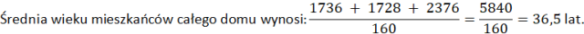 Licząc sumy wieków mieszkańców z każdej klatki i ilość mieszkańców w klatkach można policzyć średni wiek wszystkich mieszkańców: