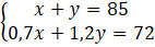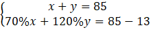 Na początku musisz oznaczyć symbolami dwie nieznane liczby. Następnie musisz zapisać pierwsze równanie, w którym ich suma to 85. Drugim równaniem będzie to, że suma 70% pierwszej liczby i 120% drugiej jest równa pierwszej sumie pomniejszonej o 13.