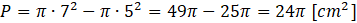 Aby obliczyć pole widocznej części czerwonego koła musisz od pola koła o promieniu 7 cm odjąć pole koła o promieniu 5 cm.