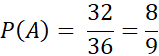 Naszą omegą jest 36, zbiór wszystkich możliwych wyników, natomiast zdarzenia sprzyjające to te gdy iloczyn wyrzuconych oczek jest mniejszy od 25 i jest takich zdarzeń 32.