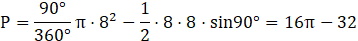 Pole obszaru obliczamy odejmując od pola wycinka kołowego pole trójkąta.