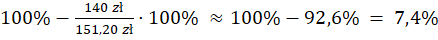 W pierwszym kroku oblicz różnicę cen brutto i netto, czyli kwotę podatku VAT. Następnie wylicz, jaka to część ceny netto – wynik przedstaw w procentach. Następnie oblicz ile procent ceny brutto stanowi cena netto i odejmij wynik od 100% - uzyskasz wynik, o ile procent cena netto jest mniejsza od ceny brutto.