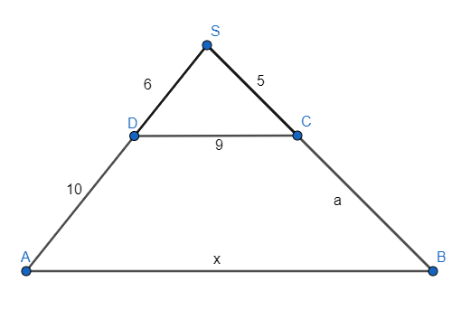 Przyjmij oznaczenia jak na powyższym rysunku. Zacznij od obliczenia długości x, korzystając z twierdzenia Talesa. Kolejno oblicz długość odcinka a. Następnie oblicz obwód trapezu ABCD i trójkąta ABS.