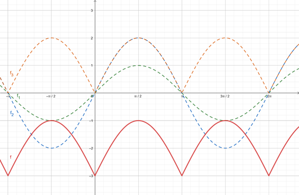 Narysuj wykres sinusa. Zwiększ zakres funkcji od -2 do 2. Zrób wartość bezwzględną z całej funkcji – dobij to, co pod osią OX nad nią. Przesuń wykres o trzy jednostki w dół. Zauważ, że funkcja przyjmuje wartości od -1 do -3 włącznie.