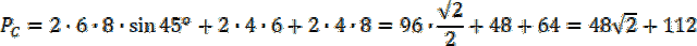 Na koniec oblicz pole całkowite bryły, czyli sumę dwóch pól podstawy i ścian bocznych, skorzystaj ze wzoru na pole równoległoboku z sinusem.