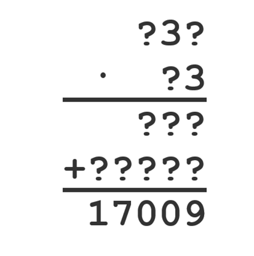 Wiemy, że nad 9 musi być 0, czyli nad zerem jest 9. Skoro jest dziewięć to musiało być pomnożone przez 3, więc na 3 też jest 3. Zamiast drugiej pytajnika w trzeciej linijce od góry też jest 9, bo 3 · 3. A skoro jest dziewięć i w sekcji dodawania pod 9 jest ? A wynika daje 0, to pod 9 jest 1. Skoro jest jeden oznacza to, że w drugiej linijce ? Jest 7, bo tylko ono pomnożone przez 3 może dać cyfrę jedności 1. W drugiej linijce od dołu jest 3 jako trzeci znak ? Od lewej, a skoro obok jest 9 + 1 i daje 0 jeden do przodu to nad trzy jest 6, z czego można wywnioskować, że w drugiej linijce od góry musi być 2.