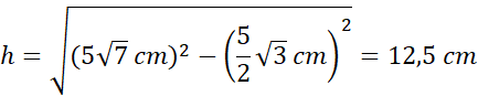 W kolejnym kroku oblicz wysokość tego zacieniowanego trójkąta. W tym celu ponownie skorzystaj z twierdzenia Pitagorasa, jako jedną z przyprostokątnych przyjmując połowę jego podstawy.