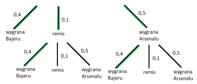 Ponieważ doświadczenie losowe jest wieloetapowe, w tym zadaniu musisz narysować drzewko. Każdy poziom drzewka będzie odpowiadał kolejnemu meczowi. W każdym meczu może wygrać albo jedna drużyna, albo mecz może się zakończyć remisem. Jeśli Bajer wygra w pierwszym meczu, to zostanie już spełniony warunek zdarzenia losowego i nie musisz rysować kolejnych gałęzi. Z kolei, jeśli w pierwszym meczu dojdzie do remisu lub wygranej Arsenału, to aby Bajer miał wygrany przynajmniej jeden mecz, musi wygrać kolejny. Do obliczenia prawdopodobieństwa remisu w pojedynczym meczu możesz podejść na dwa sposoby. Remis to zdarzenie przeciwne do wygranej którejkolwiek drużyny, więc wystarczy, że od 1 odejmiesz prawdopodobieństwo wygranej którejkolwiek drużyny, a to prawdopodobieństwo to suma prawdopodobieństw wygranej w meczu dla każdej drużyny. Możesz też zauważyć, że suma prawdopodobieństw w gałęziach wychodzących od jednego zdarzenia musi wynosić 1. Gdy już narysujesz drzewo zaznacz te zdarzenia, których prawdopodobieństwo będziesz liczył oraz wszystkie gałęzie po drodze. Następnie przemnóż przez siebie prawdopodobieństwa na poszczególnych gałęziach oraz dodaj do siebie uzyskane wyniki z różnych gałęzi.