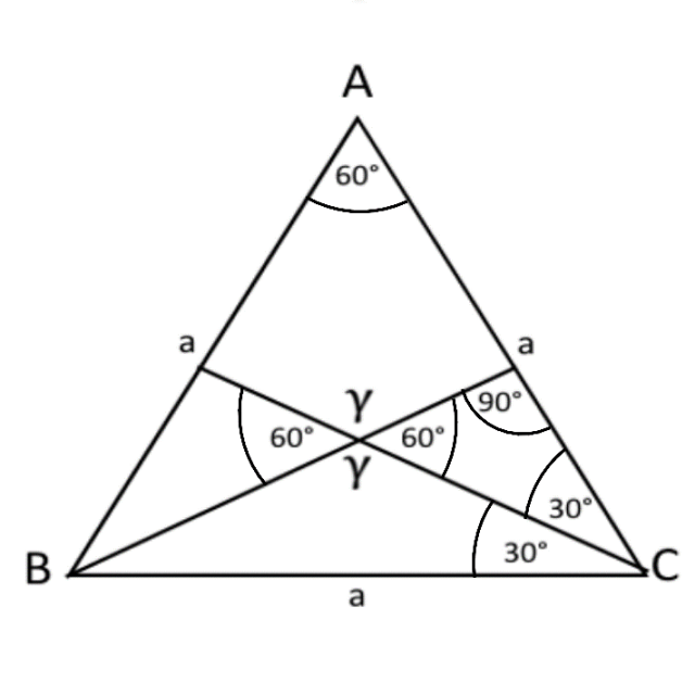 Trójkąt równoramienny ABC ma dwie dwusieczne, które dzielą kąt 60° na dwa, tj. po 30°. Kąt przyległy kątowi γ ma zatem 60°, czyli miara kąta γ: