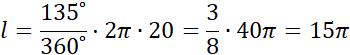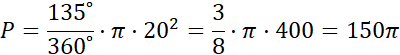 W tym zadaniu oblicz długość zaznaczonego łuku okręgu oraz pole zacieniowanej figury, wiedząc, że α = 135˚ i r = 20.