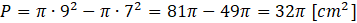 Aby obliczyć pole widocznej części fioletowego koła musisz od pola koła o promieniu 7 cm odjąć pole koła o promieniu 5 cm.