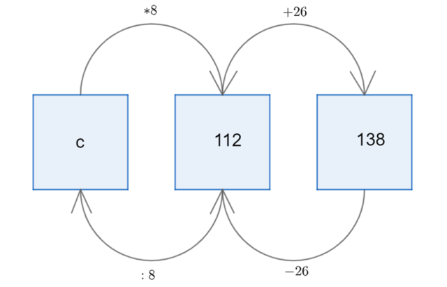Niewiadomą najpierw pomnożono przez 8, a następnie powiększono o 26, zapisz te działania w takiej kolejności nad górnymi strzałkami. Wynikiem tych operacji jest liczba 138 – umieść ją w ostatnim polu. Na dolnych strzałkach wypisz działania odwrotne do tych, które znajdują się nad nimi i wykonuj je w odwrotnej kolejności (tak, jak prowadzą strzałki). Wynik dzielenia liczby 112 przez 8 to wartość szukanej liczby.