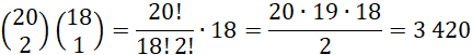 Wybierasz 2 miejsca spośród 20, na których umieścisz cyfrę 2 oraz jedno miejsce spośród pozostałych 18 dla liczby 6, na reszcie miejsc będą stały jedynki: