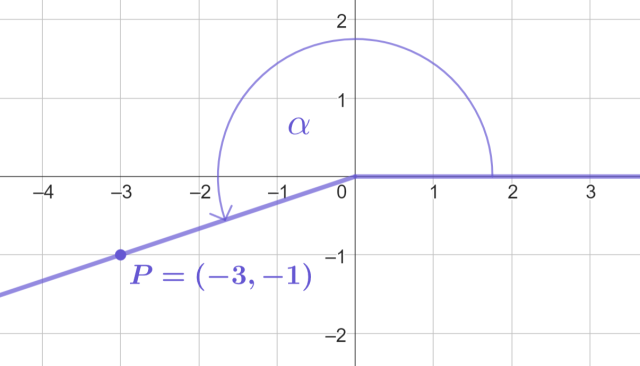 Niech punkt P = (x0, y0) będzie puntem leżącym na ramieniu końcowym kąta α. Ramię to leży w III ćwiartce układu współrzędnych, zatem:
