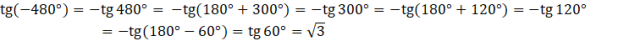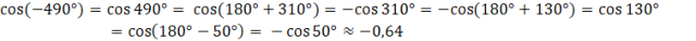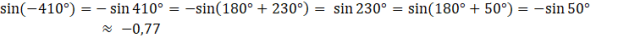 Mając dane funkcje trygonometryczne: sin (-410°), cos (-490°), tg (-480°), wyznacz je, używając wzorów redukcyjnych.