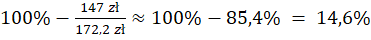 W pierwszym kroku oblicz ceny brutto przy podatku 23% i 5%. W tym celu przemnóż cenę netto razy odpowiednio 123% lub 105%. Następnie od 100% odejmij iloraz tych cen – otrzymasz, o ile % obniżyła się cena brutto po obniżce podatku.