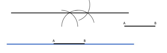 2. Z punktu oznaczonego jako jeden z końców odcinka na narysowanej przez siebie prostej nakreśl łuk o rozwartości odcinka AB. Z drugiego końca oznaczonego na prostej odcinka AB nakreśl kolejny łuk.