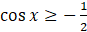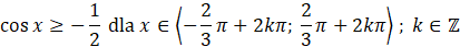 Przeanalizuj sytuację graficznie i znajdź punkty krańcowe jednego z przedziałów, którym spełniona jest rozpatrywana nierówność. Czyli, innymi słowy, znajdź taki przedział, w którym cosinusoida leży powyżej lub pokrywa się z prostą o równaniu