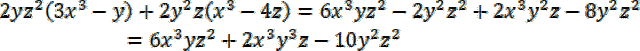 Pomnóż każdy wyraz znajdujący się w nawiasie przez jednomian stojący przy nim i zredukuj wyrazy podobne, czyli dodaj/odejmij jednomiany podobne.
