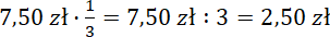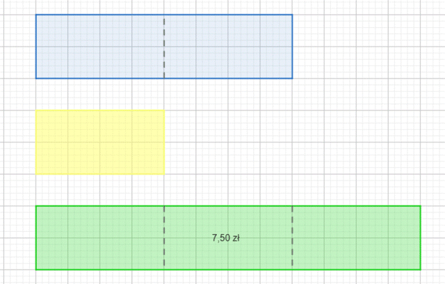 W tym zadaniu wygodniejszym sposobem będzie metoda graficzna: w metodzie prób i błędów musielibyśmy sprawdzać różne liczby dziesiętne, co mógłby być czasochłonne. Jedna z gazet jest 2 razy tańsza od drugiej, czyli jej fragment na rysunku jest dwukrotnie krótszy. Razem tworzą trzy krótsze odcinki, czyli tańsza to jedna trzecia całej kwoty, a droższa – dwie trzecie. Pomnóż cenę gazet przez te ułamki – otrzymasz cenę każdej z nich.