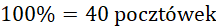 Jacek potrzebuje 40 pocztówek, co stanowi 100%. Musisz dodać wszystkie pocztówki, które już zebrał. Ma ich więcej, niż potrzebował. Podziel teraz liczbę zebranych pocztówek przez liczbę potrzebnych pocztówek, a następnie pomnóż razy 100%.