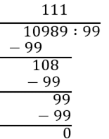 Wykonaj dzielenie: 10 989 : 99, aby obliczyć przez jaką liczbę trzeba podzielić 10 989, żeby otrzymać 99.