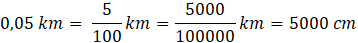 Zapisz ilość kilometrów w postaci ułamka zwykłego. Następnie rozszerz go do mianownika 100000, (bo 1 km = 100000 cm). Licznik to będzie ilość centymetrów. Porównaj te długości zapisane w centymetrach