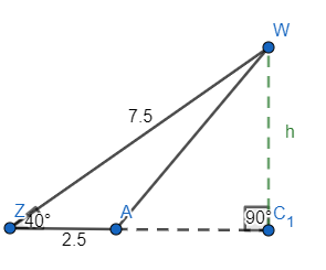 Narysuj trójkąt, którego boki będą miały 7,5 cm i 2,5 cm, a kąt między nimi będzie wynosił 40°, a następnie narysuj jego najdłuższą wysokość. Napisz, jak położona jest ta wysokość, względem najkrótszego boku trójkąta.