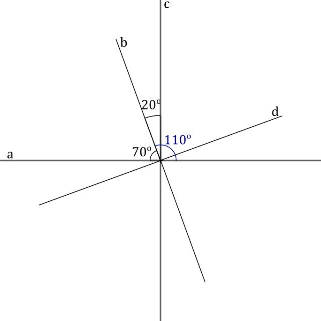 Miara kąta między c i d jest taka sama jak miara kąta między prostymi a i c. Kąt między prostymi prostopadłymi jest równy 90o. Suma miar kątów przyległych jest równa 180o. Miara kąta między prostą a i d to różnica miary kąta między b i d, a miarą kąta między prostą a i b. Podobnie miara kąta między prostą b i c to różnica miary kąta między b i d, a miarą kąta między prostą c i d.