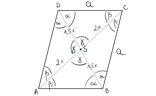 Narysuj dany równoległobok i nanieś dane na rysunek. Zauważ, że w środku tego równoległoboku są 4 równe kąty, których sumy jest równa