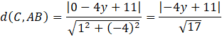 Oblicz wartość, jaką przyjmuje wysokość trójkąta. Następnie wyznacz równanie prostej AB i oblicz odległość punktu C od prostej AB i przyrównaj otrzymane wyrażenie do obliczonej wysokości. Wyznacz dwie możliwości współrzędnych punktu C.