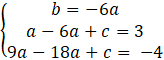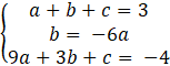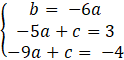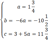 Podstaw wyznaczoną wartość współczynnika b. Zredukuj jednomiany podobne. Od drugiego równania odejmij trzecie, wyznacz w ten sposób wartość a.Podstaw a pod pozostałe równania, wyznaczając tym samym wartości współczynników b i c.