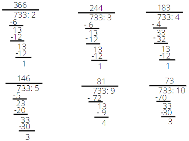 733 : 3 = 244 r. 1