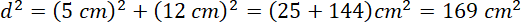Trójkąt prostokątny o przyprostokątnych 5 cm i 12 cm przekształcono przez symetrię środkową względem punktu, który jest środkiem przeciwprostokątnej. Po przekształceniu powstał prostokąt o bokach 5 cm i 12 cm. Oblicz długość przekątnej, korzystając z twierdzenia Pitagorasa: