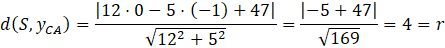 Udowodnij, że okrąg, którego środek znajduje się w punkcie S(0, -1) oraz promień wynosi 4 jest wpisany w trójkąta, którego wierzchołki to punkty A(-6, -5), B(8, -5), C(-1, 7).
