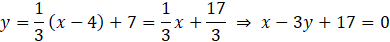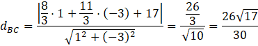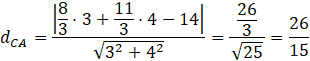 Najpierw wyznacz środki boków tego trójkąta, a następnie proste zawierające środkowe tego wielokąta – ich punkt przecięcia to punkt P. Następnie wyznacz równania prostych zawierających jego boki i oblicz odległość punktu P od nich.