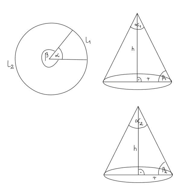 Oblicz długość promienia r stożków korzystając ze wzorów na długość łuku okręgu.
