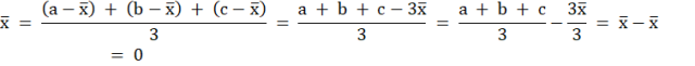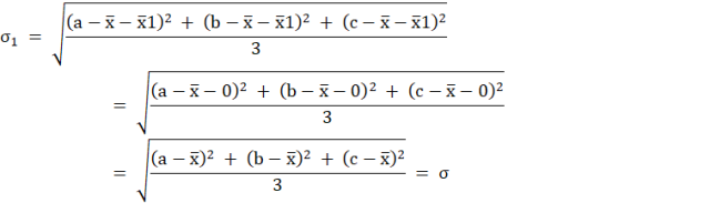 Uzasadnij, że odchylenie standardowe zestawu trzech liczb: a-x, b-x, c-x jest takie samo jak odchylenie standardowe zestawu liczb a, b, c wiedząc, że x to średnia arytmetyczna liczb a, b i c.