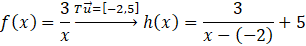 Zauważ, że funkcja f jest funkcją wymierną której wykresem jest hiperbola o asymptotach zadanych równaniami x = 0 oraz y = 0 (czyli proste pokrywające się z osiami układu współrzędnych). Punktem przecięcia się asymptot jest oczywiście punkt (0, 0). Z kolei funkcja h, na podstawie tego co możesz odczytać z wykresu, także jest funkcją wymierną, o asymptotach zadanych równaniami x = -2 oraz y = 5. Ich punktem przecięcia jest punkt (-2, 5). Skoro funkcja h powstała przez przesunięcie funkcji f, to punkt przecięcia się asymptot funkcji h jest przesuniętym punktem przecięcia się asymptot funkcji f. Aby przesunąć punkt o współrzędnych (0, 0) do punktu (-2, 5), musisz zadziałać wektorem [-2, 5]. I o ten sam wektor przesunięta będzie cała funkcja f, co możesz zapisać jako: