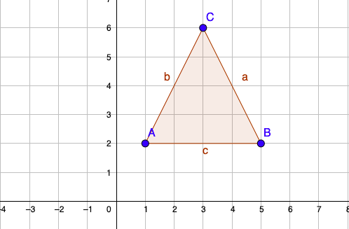 Jako że jest to trójkąt równoramienny, poprowadź od środka odcinka AB wysokość o długości 4 jednostek, a od niej dwa ramiona do brzegów podstawy.