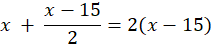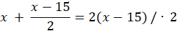 Niech x to będzie liczba książek na pierwszej półce. Wtedy na drugiej półce jest x – 15 książek. Liczba (x – 15) : 2 to liczba książek na trzeciej półce. Suma książek na pierwszej i trzeciej półce to dwukrotność liczby na drugiej. Powstaje równanie: